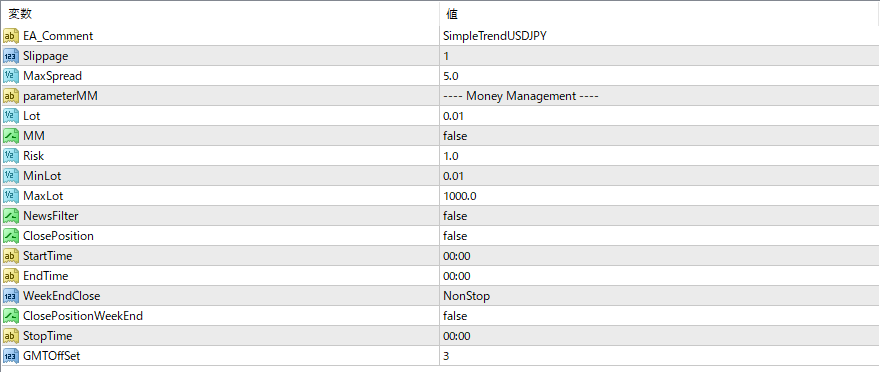Lot 固定ロット値です。MMがfalseの場合、こちらの値でポジションを建てます。