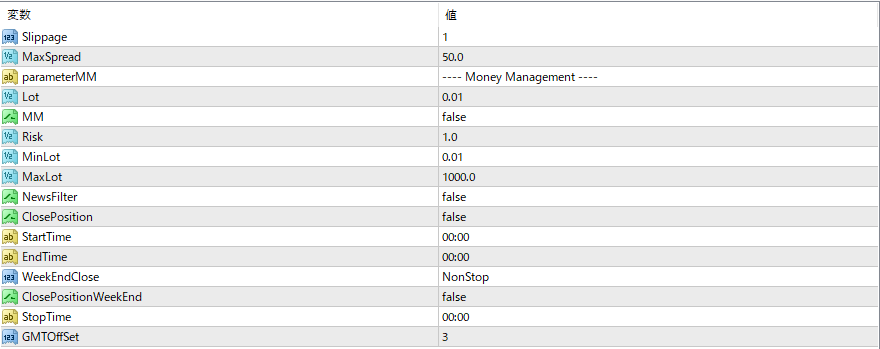 WeekEndClose 週末クローズ機能です。offにしたい場合はNonStop、onにしたい場合はお使いの業者のサーバータイムに合わせて選択してください。多くのFX業者ではFridayがニューヨーククローズになります。