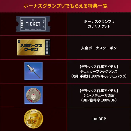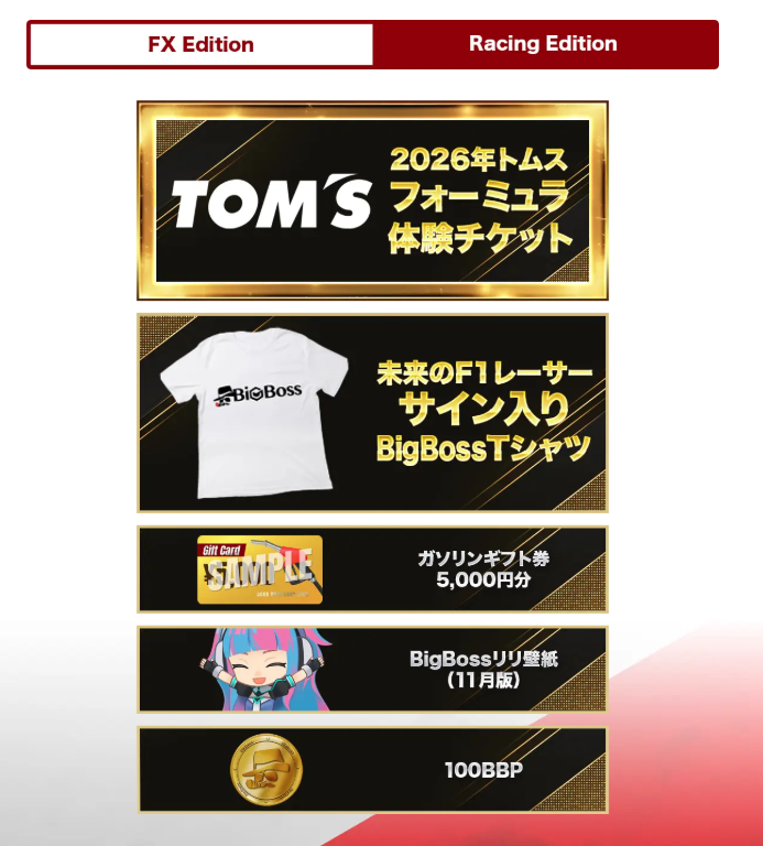 BIGBOSSのボーナスグランプリは、取引量の可視化とゲーム性によって取引へのモチベーションを高める工夫がされたキャンペーンです。