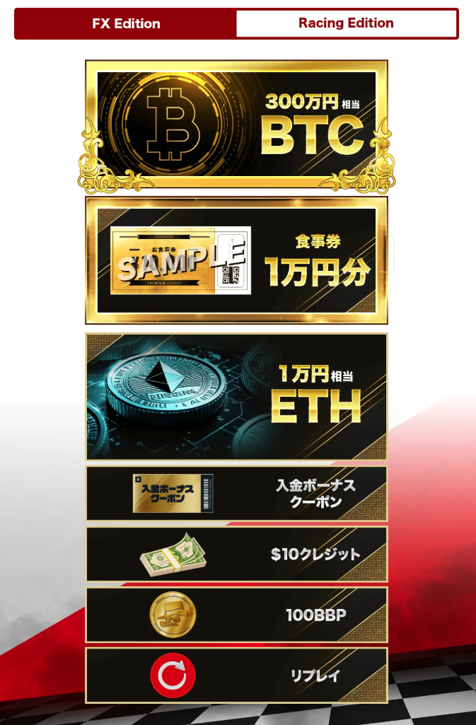 ボーナスグランプリは、取引量に応じてマシンを進めるゲーム形式を採用しています。マイページの特設ページから進行状況を確認できるため、モチベーションを維持しながら取引を行えます。