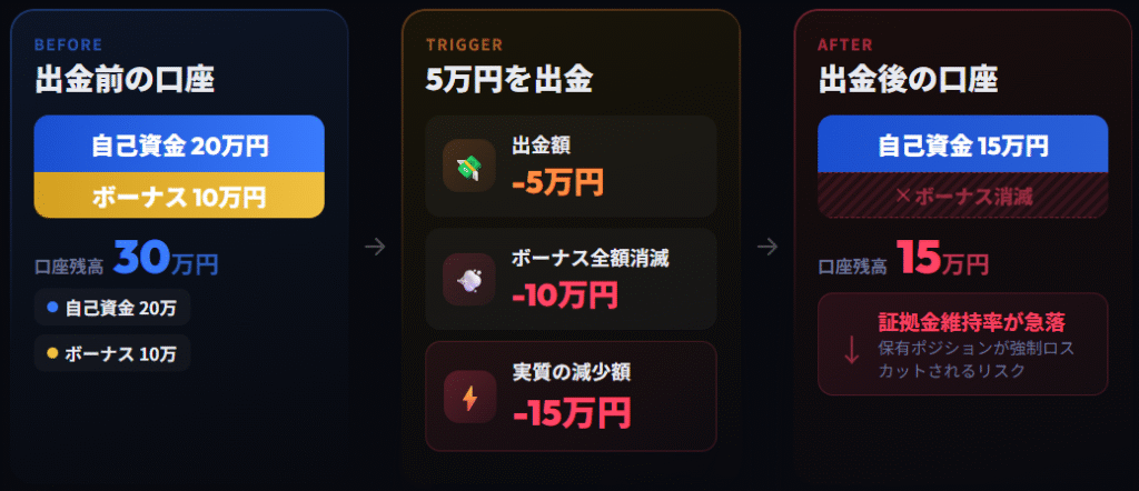 大前提として、ボーナスそのものは出金できません。出金できるのはボーナスを使って得た利益部分ですが、この利益を引き出す際にもボーナスが消滅する仕組みになっています。