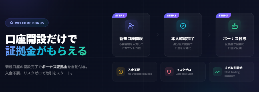 口座開設ボーナス(ウェルカムボーナス・未入金ボーナスとも呼ばれます)は、新規口座を開設するだけで証拠金が付与される仕組みです。