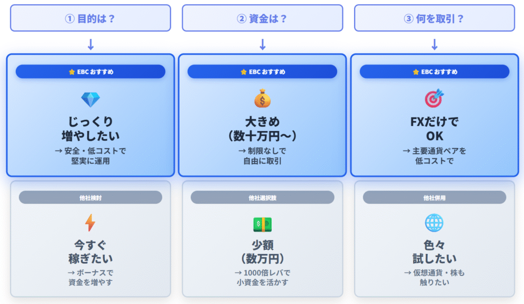 | ある程度まとまった資金があるなら | EBCの制限なしレバレッジが魅力 |