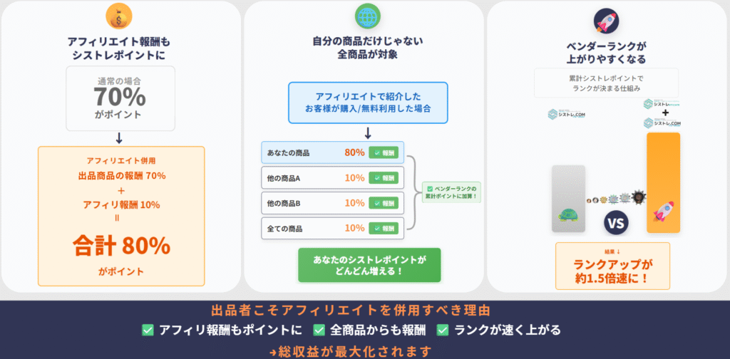 アフィリエイトを併用することで、このベンダーランクの上昇速度が約1.5倍に加速し、長期的な収益性が大きく向上します。