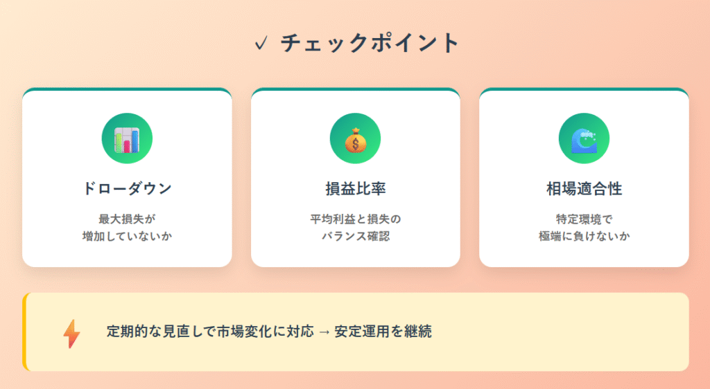 ポートフォリオEAを運用する際には、 適切なEAの組み合わせだけでなく、継続的な見直しや調整 も必要です。