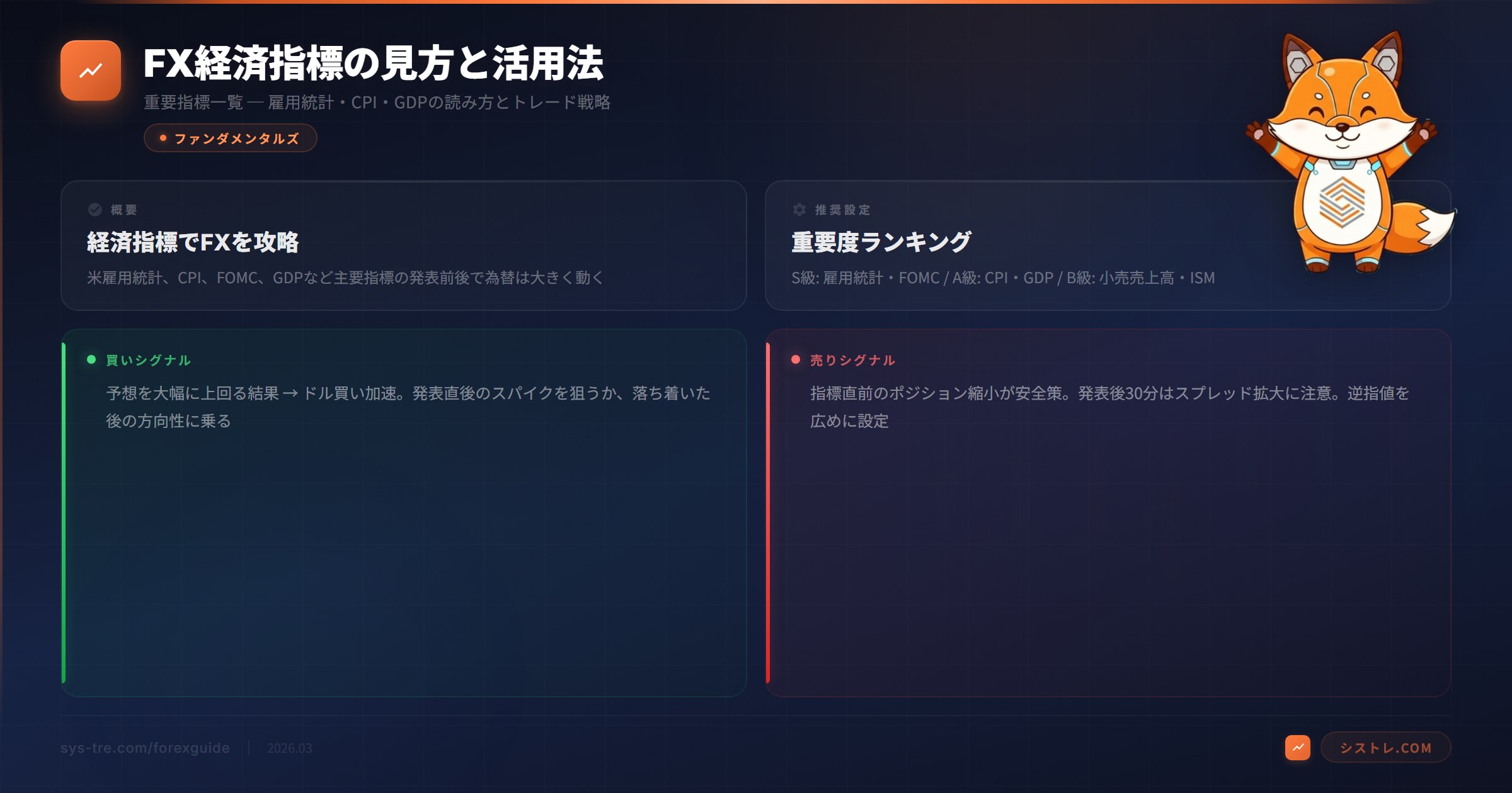 米雇用統計、FOMC政策金利発表、CPI(消費者物価指数)などの重要な経済指標発表時には、市場が急変動しやすくなります。