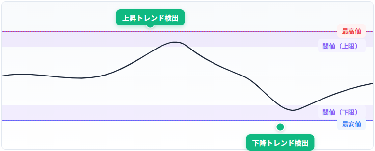 まず設定した期間内の最高値と最安値を確認し、そこに閾値(しきい値)という基準を適用します。