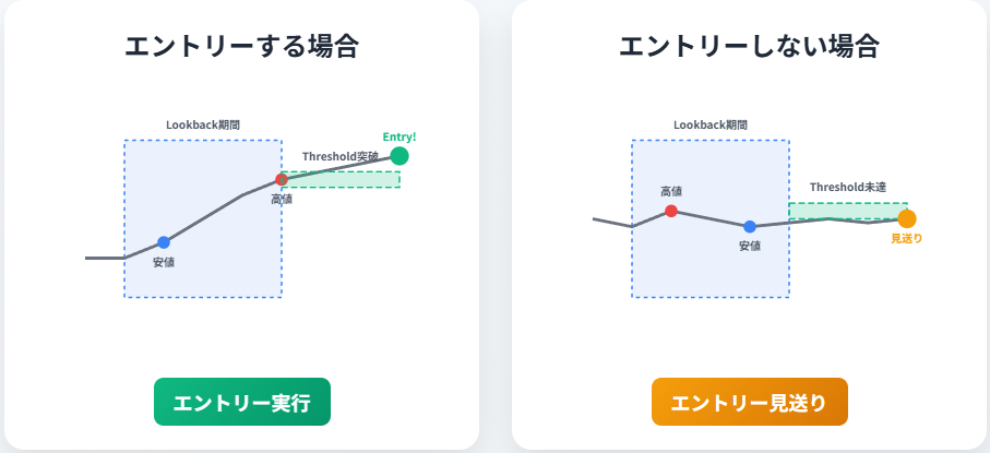 エントリーロジックは、指定した期間における高値・安値の位置関係(Lookback×Threshold)を指標とし、トレンドの初動または反転局面でのポジション構築を狙います。