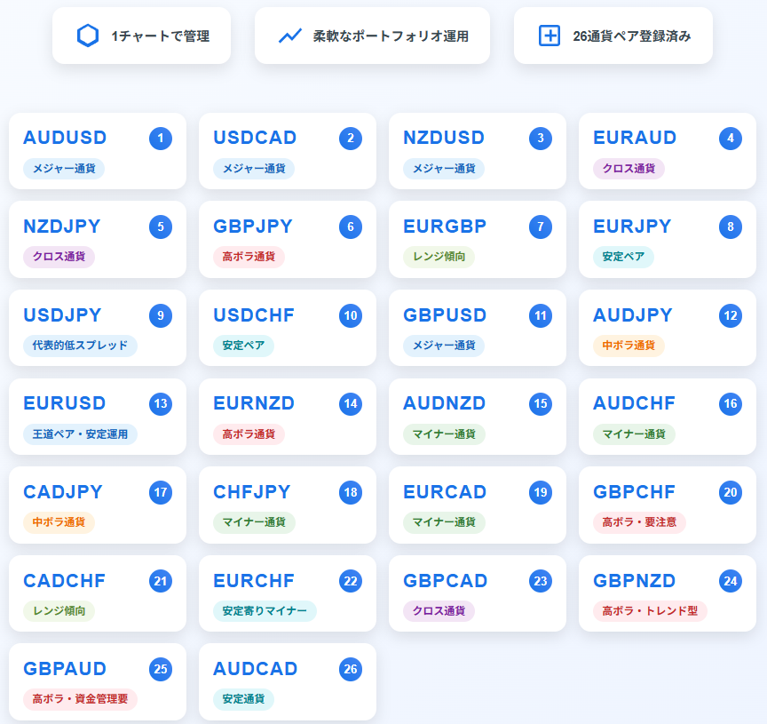 Currency Finalis は、最大30通貨ペアまでエントリー対象を登録可能ですが、デフォルトでは以下の 26通貨ペアがあらかじめ登録されています。1チャートで複数通貨を一括管理し、シンプルかつ柔軟なポートフォリオ運用が可能です。