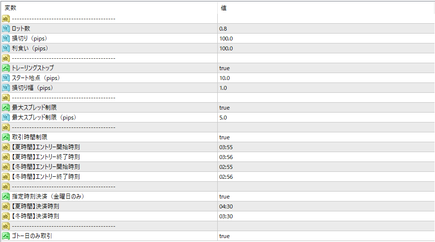 | 決済時間 | 取引タイプ | 始値 | 終値 | シンボル | 保有時間 | ロットサイズ | 損益 |