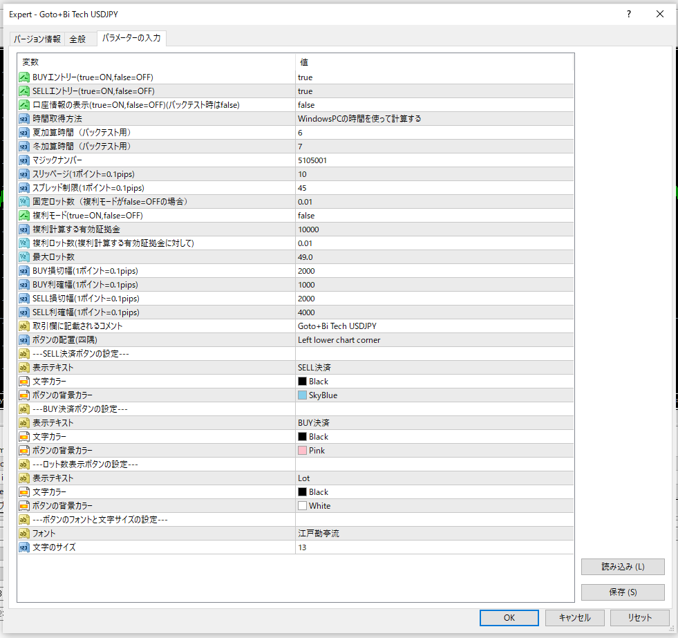 EAで計算された時間を使う(バックテスト用)=バックテストで夏時間と冬時間を計算してテストするときに使用します。